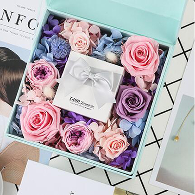 进口永生粉色玫瑰2枝(直径5-6cm),紫色玫瑰1枝,紫色奥斯丁玫瑰2枝,浅粉桃小玫瑰2枝,搭配粉色、蓝色、紫色绣球,兔尾草。