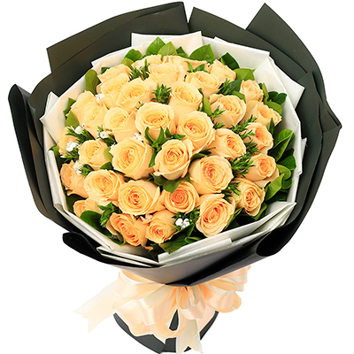 香槟玫瑰x33枝 栀子叶、石竹梅点缀,白色棉纸内包,黑色包装纸外围圆形包装,香槟色丝带蝴蝶结。