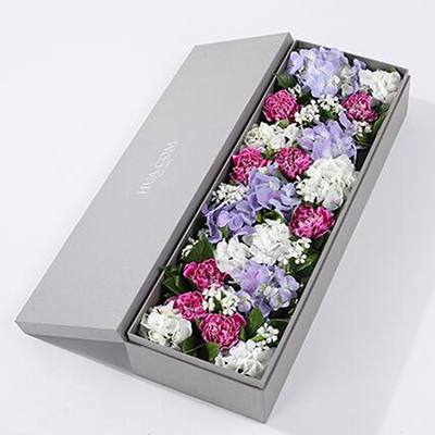 紫色白边康乃馨8枝、白绣球1枝、蓝紫色绣球1枝